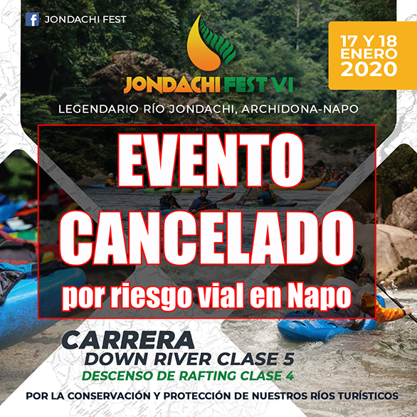 JONDACHI FEST CANCELADO POR RIESGO VIAL EN NAPO Tena, 08 de enero de 2020 - Con el objetivo de precautelar la seguridad de los participantes en los eventos deportivos y turísticos que nosotros organizamos, y de la ciudadanía en general, la FUNDACIÓN RÍO NAPO informe sobre la cancelación de la sexta edición del JONDACHI FEST debido al alto nivel de riesgo asociado con las obras de emergencia vial en la provincia de Napo y el anuncio de las nuevas restricciones de tránsito en la vía Quito-Baeza-Tena que rigen hasta el 21 de febrero del 2020, que impide el desarrollo de este evento nacional e internacional de una manera segura y responsable. ¡VÍAS SEGURAS DE CALIDAD! www.facebook.com/fundacionrionapo www.facebook.com/jondachifest